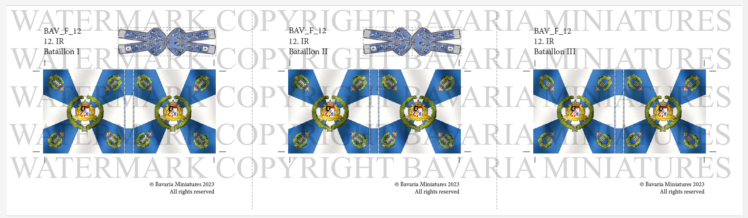 This set will give you three flags of the three battalions of the 12th Line Infantry Regiment, printed in high quality & colour saturation on easy bendable paper.